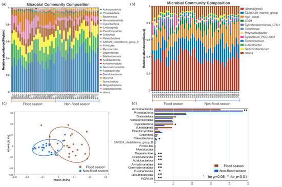 The relative abundance of bacterial communities at the phylum level during the flood season and the non-flood season is shown in Figure 4a. The bacterial phyla with the highest average relative abundance were Actinobacteriota (41.08%), Proteobacteria (16.92%), Bacteroidota (10.63%), Verrucomicrobiota (9.64%), Cyanobacteria (7.48%), Planctomycetota (3.47%), Chloroflexi (1.45%), and Patescibacteria (1.09%). During the flood season, the dominant phyla were Actinobacteriota and Proteobacteria, accounting for 35.24% and 16.69% of the total sample sequences, respectively. During the non-flood season, the dominant phylum was Actinobacteriota, accounting for 46.92% of the total sample sequences. The proportions of Actinobacteriota and Proteobacteria were higher during the non-flood season than during the flood season, while Bacteroidetes showed higher relative abundance during the flood season.
