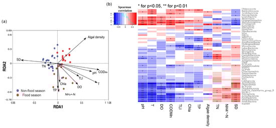 The relationship between bacterial communities and environmental factors was revealed by redundancy analysis (RDA), as shown in Figure 5a. The arrows, dots, and their angles represent environmental factors, samples, and their correlations, respectively. An acute angle indicates a positive correlation between environmental factors and samples, while a blunt angle indicates a negative correlation. Longer arrow lengths denote stronger influences on microbial community composition. The results showed that algal density, permanganate index (CODMn), pH, temperature (T), dissolved oxygen (DO), trophic-level index (TLI), chlorophyll-a (Chla), total phosphorus (TP), and ammonia nitrogen (NH4+-N) were all positively correlated with bacterial communities during flood seasons, while transparency (SD) and total nitrogen (TN) were positively correlated with bacterial communities during non-flood seasons.