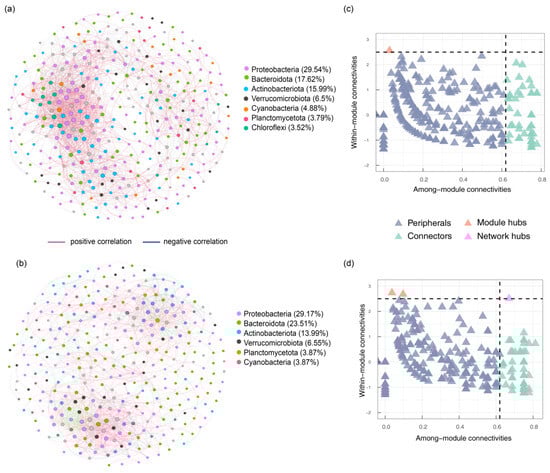 In co-occurrence networks, those with high node degrees and high betweenness centrality are identified as keystones (Figure 6c,d), and they are categorized as peripheral hubs, connector hubs, module hubs, and network hubs. During the non-flood season, a total of 383 peripheral hubs (Zi < 2.5, Pi < 0.62), 63 connector hubs (Zi < 2.5, Pi > 0.62), and 4 module hubs (Zi > 2.5, Pi < 0.62) were observed in the co-occurrence network. During the flood season, a total of 398 peripherals hubs (Zi < 2.5, Pi < 0.62), 66 connectors hubs (Zi < 2.5, Pi > 0.62), 4 module hubs (Zi > 2.5, Pi < 0.62), and 1 network hub (Zi > 2.5, Pi > 0.62) were identified. The microbial communities’ details of the keystones are presented in Tables S6 and S7.