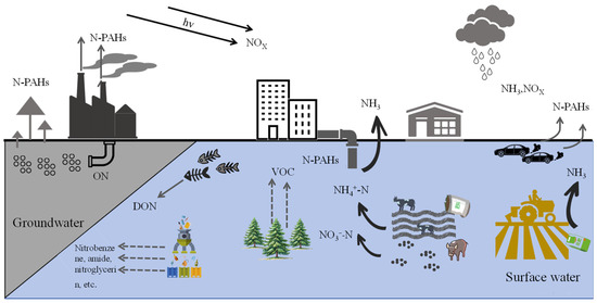 Nitrogen plays a crucial and multifaceted role in nature [1,2]. As one of the primary components of the atmosphere, nitrogen gas (N2) makes up approximately 78% of it. Nitrogen is a fundamental component of proteins, nucleic acids, and other vital biological molecules, directly influencing the growth, development, and function of organisms. It is also a key element for plant growth and industrial production, being essential for crop yields and the quality of synthetic materials [3,4]. The rapid growth of industrial production has led to human activities tripling the nitrogen (N) input rate into global terrestrial ecosystems compared to the pre-industrial era [5]. Nitrogen pollution primarily arises from human activities, including industrial production, automobile exhaust emissions, fossil fuel combustion, improper fertilizer use, large-scale deforestation, and vegetation burning [6], as illustrated in Figure 1. For instance, excessive emissions of harmful gases such as nitrogen oxides (NOx) and free ammonia (NH3) contribute to air pollution, soil erosion, acidification, and the contamination of surface and groundwater [7]. According to data from China’s Ministry of Ecology and Environment, between 2016 and 2019, ammonia nitrogen NH3-N discharges in wastewater ranged from 46.3 to 56.8 million tons, while NOx emissions in waste gas ranged from 12.34 to 15.03 million tons [8]. According to the 2020 China Ecological and Environmental Statistics Yearbook, nationwide emissions of NOx in waste gas reached 10.197 million tons, and NH3-N discharges in wastewater surged to as high as 9.84 million tons [9]. In addition, according to data from the National Agricultural Sustainable Development Plan (2015–2030) [10], the fertilizer and pesticide utilization rate in the country is below one-third, the mulch film recycling rate is under two-thirds, the effective treatment rate of livestock and poultry waste is less than 50%, and straw burning and water bodies are severely eutrophied. Notably, nitrogen fertilizer use in the country accounts for 35% of the world’s total consumption, with the usage per unit area being 2.74 times higher than the global average [11].