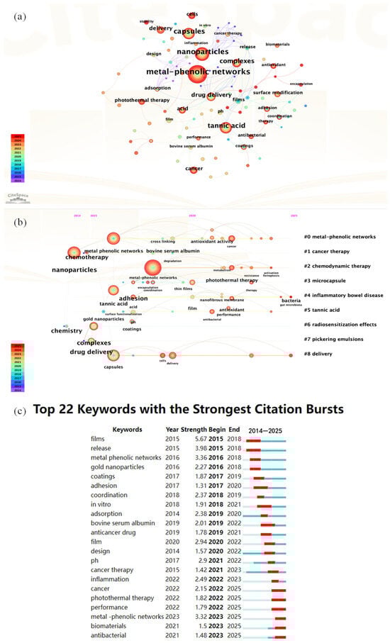 Figure 2a shows a keyword co-occurrence network map generated by CiteSpace, V6.3R1 (Philadelphia, PA, USA) based on the literature published from 2014 to 2025. The core nodes are clustered around three primary themes: ‘metal-phenolic networks,’ ‘tannic acid,’ and ‘nanoparticles’. Emerging research hotspots extend outward, encompassing ‘drug delivery’, ‘photothermal therapy’, ‘surface modification’, ‘capsules’, and ‘complexes’. The node colors shift from light to dark (blue to red), indicating the temporal progression from 2014 to 2025. Significantly, there has been rapid growth in emerging research directions, such as ‘drug delivery’, ‘photothermal therapy’ and ‘surface modification’ in recent years. When applied to nitrogen removal research, metal–phenolic network materials, which are characterized by multivalent metal centers strongly coordinated with phenolic hydroxyl groups and abundant surface functional groups, can be tailored through surface modification or nanocomposite strategies to create highly efficient adsorbents or catalysts. These materials facilitate highly selective adsorption and transformation of nitrogen pollutants, such as ammonia and nitrate, in water, thereby opening up new application prospects for MPNs in environmental nitrogen remediation.