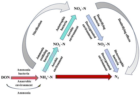 According to the classification in the “Grading Standards for Pollution Levels of Urban Black and Odorous Water Bodies” [106], NH3-N concentration is a critical indicator of black and odorous water bodies. NH3-N in black and odorous water arises from various sources, including domestic sewage, industrial wastewater, and residual fertilizers from agricultural activities. NH3-N primarily exists in two forms in water: NH4+ and NH3. Under acidic conditions, NH3-N predominantly exists as NH4+, whereas under neutral or alkaline conditions, it primarily exists as NH3. At high water temperatures, NH3-N is more likely to be present as ammonium salts, whereas at lower temperatures, free NH3 is the dominant form [147]. NH3-N is a primary contributor to the eutrophication of water bodies and the formation of harmful algal blooms, such as red tides. Elevated concentrations of NH3-N significantly impact the survival of aquatic organisms. The microbial activity associated with NH3-N consumption depletes DO, further reducing oxygen levels in black and odorous water and thereby severely disrupting the ecological environment. Additionally, NH3-N is a major precursor of disinfection by-products. It forms chloramine during the chlorination and disinfection processes, thereby reducing disinfection efficiency [148]. NH3-N in black and odorous water reacts under microbial influence, and a schematic diagram illustrating the conversion of NH3-N, NO3−-N, and NO2−-N is shown in Figure 5.