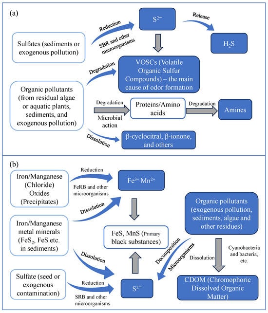 Nitrogen compounds, particularly ammonium and nitrate, play a pivotal role in the formation of black and odorous water bodies, as they facilitate the development of anaerobic conditions and stimulate the generation of malodorous compounds, including ammonia and amines. Additionally, black compounds like FeS and MnS contribute to the water’s discoloration [119]. The primary chemical reactions responsible for the blackening are outlined below [120]. The primary process is illustrated in Figure 4a.