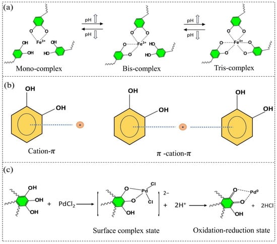 Metal–polyphenol interaction mechanisms as illustrated in [160]: (a) coordination, (b) cation–π Bond, (c) redox reactions.