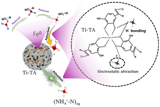 A schematic diagram illustrating the mechanism for the removal of aquatic nitrogen by the nZVI/Ti-TA composite [206].