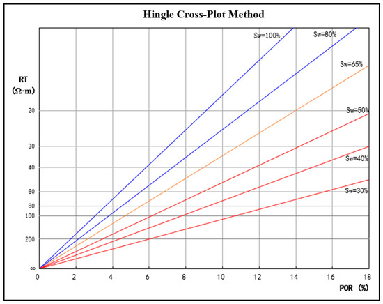The values of a, b, m, and n vary depending on the region and can be obtained through the analysis of rock electrical experiments; the formation water resistivity can be determined from water analysis data or calculated based on well logging data by identifying pure water layers. For a specific block, can be a constant value. Therefore, within a certain interpretation interval and for a determined water saturation , we can set (where A is a constant). By constructing the y-axis with the scale and the x-axis with a linear scale , Equation (2) becomes the linear equation on the cross-plot, and this line passes through the origin ( = 0, ). Different lines can be obtained based on various values, leading to the construction of a resistivity–porosity cross-plot scaled by , which is known as the Hingle cross-plot (as shown in Figure 1) [10].