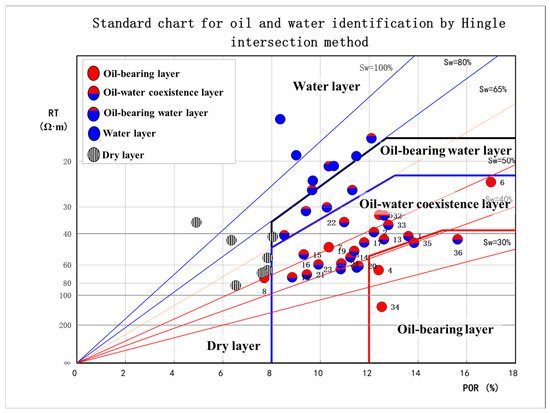 Based on the electrical classification, according to the thickness of the reservoir, physical properties, oil bearing, and other parameters, and combined with the oil test conclusion (wells with a return rate greater than 100%, as shown in Table 2), it is divided into five categories: oil layer, oil–water layer, oil-bearing water layer, water layer, and dry layer, and the specific classification criteria are shown in Table 3. Based on this, the oil and water layer identification chart of the Hingle intersection method (Figure 2) was established, and the fluid identification accuracy rate was 80% (No. 5, No. 6, No. 7, No. 8, and No. 36 oil test layers could not be accurately identified on the chart), which could better identify different fluid types and was suitable for this research block. The cause of the low-resistance reservoir [14,15] needs further research and verification and is not within the scope of this paper.