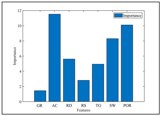 As shown in Table 4, hyperparameter optimization is conducted for two modeling parameters of the random forest model [16,17]. These parameters are the number of trees in the forest (ntree), which represents the total number of decision trees included in the algorithm, and the decision tree depth (mtry), which refers to the number of nodes on the longest path of the tree and is also the length of the node path from the root node to the farthest leaf. The upper and lower bounds of the optimization ranges for the above two parameters are stored in arrays U and L, respectively, and then input into the Nutcracker Optimization Algorithm (NOA) to find the optimal values. In NOA, the five-fold cross-validation method is specifically used as a reference to evaluate the model effect of each iteration, and this method is employed to search for the optimal values in the parameter space [18,19,20,21]. Five-fold cross-validation means that during each iteration, the dataset is randomly divided into five sub-sample sets of equal size. Each time, one of the sub-sample sets is selected as the test set, and the remaining four sub-sample sets are used as the training set. Through five iterations, it is ensured that each sub-sample set is used as the test set once [22]. In this study, the gamma ray curve (GR), acoustic transit time curve (AC), deep resistivity curve (RD), shallow resistivity curve (RS), total hydrocarbon curve (TG), calculated water saturation curve (SW), and calculated porosity curve (POR), which are available in most wells, are selected as the input feature curves. The GR curve mainly reflects the shale content of the reservoir. The AC curve and POR curve mainly reflect the storage capacity of the reservoir. The RD curve, RS curve, and SW curve mainly reflect the oil-bearing property of the reservoir. The difference between the RD curve and the RS curve can, to a certain extent, reflect the seepage capacity of the reservoir. The TG curve can qualitatively determine the oil-bearing property of the reservoir. The sample data is divided into a training set (a dataset used for training the machine learning model) and a test set (a dataset used for evaluating the model performance) at a ratio of 7:3. Figure 4 shows the weight values of each curve in the trained model. (The testing hardware is a laptop computer: CPU: 13th Gen Intel(R) Core(TM) i9-13900HX; GPU: NVIDIA GeForce RTX 4060 Laptop (Equipment purchased from Yuncheng City, Shanxi Province, China, manufacturer Lenovo); RAM: two DDR5-8GB memory modules. The operating environment is MATLAB (Version 2019a) software, and the running time is 482 s.)