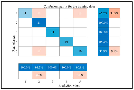 Training set confusion matrix diagram (1—oil layer; 2—oil and water layer; 3—oily water layer; 4—water layer; 5—dry layer).