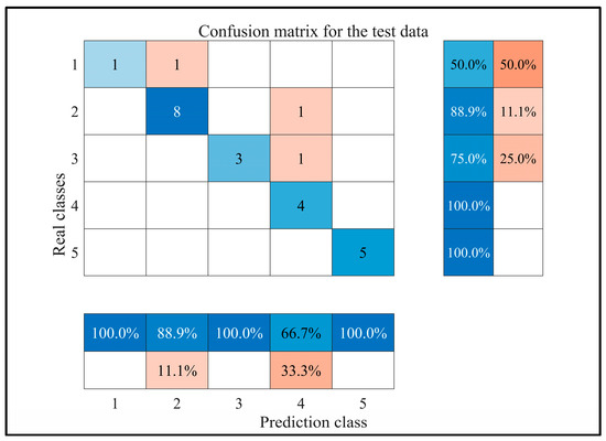 Test set confusion matrix diagram (1—oil layer; 2—oil and water layer; 3—oily water layer; 4—water layer; 5—dry layer).