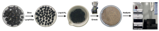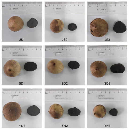 Nine types of black garlic were sourced from Jiangsu, Shandong, and Yunnan province (Figure 2). For each type, three parallel samples were collected. Each parallel sample (1 kg) was first frozen at −80 °C for several hours and then subjected to freeze-drying (Scientz-18N, Ningbo Scientz Biotechnology Co., Ltd., Ningbo, China) for 48 h. The freeze-dried black garlic samples were ground using a grinder (800-Y, Yongkang Bo’ou Hardware Products Co., Ltd., Yongkang, China) and stored at 4 °C for subsequent analysis (Figure 3).