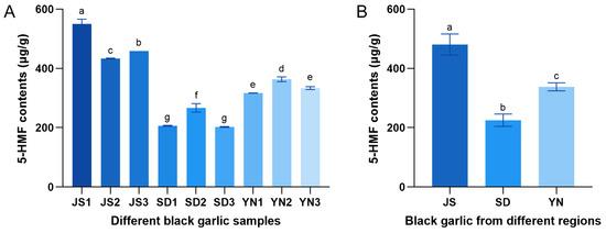 The contents of 5-hydroxymethylfurfural (5-HMF) in different black garlic samples (A), the mean values of 5-HMF in black garlic from different regions (B). Different lowercase letters indicate significant differences between groups (p < 0.05). Groups sharing the same letter are not significantly different (p > 0.05).