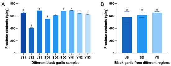 The contents of fructose in different black garlic samples (A), the mean values of fructose in black garlic from different regions (B). Different lowercase letters indicate significant differences between groups (p < 0.05). Groups sharing the same letter are not significantly different (p > 0.05).