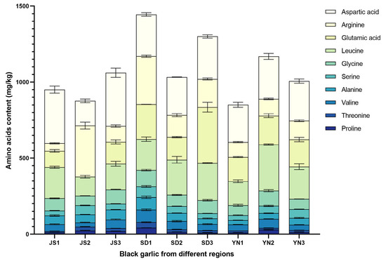 In this study, the types and contents of amino acids in black garlic samples from different regions were analyzed. A total of ten amino acids were detected, namely proline, threonine, valine, alanine, serine, glycine, leucine, glutamic acid, arginine, and aspartic acid. The contents of these ten free amino acids and the total amino acids are shown in Figure 6. The results indicated that the total amino acids content was highest in SD samples (1259.383 ± 120.61 mg/kg), followed by YN (1008.62 ± 91.95 mg/kg), and lowest in JS (962.85 ± 53.69 mg/kg). Although differences in total amino acids content were observed among samples from different regions, statistical analysis showed that these differences were not significant (p > 0.05).