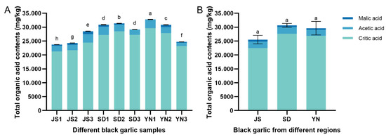 The contents of total organic acid in different black garlic samples (A), the mean values of total organic acid in black garlic from different regions (B). Different lowercase letters indicate significant differences between groups (p < 0.05). Groups sharing the same letter are not significantly different (p > 0.05).
