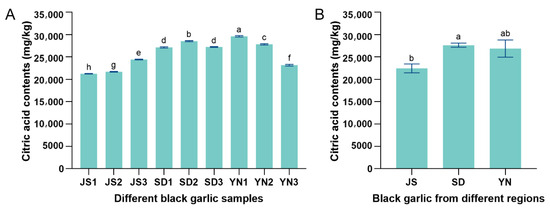 The contents of citric acid in different black garlic samples (A), the mean values of citric acid in black garlic from different regions (B). Different lowercase letters indicate significant differences between groups (p < 0.05). Groups sharing the same letter are not significantly different (p > 0.05).