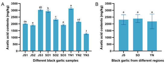 The contents of acetic acid in different black garlic samples (A), the mean values of acetic acid in black garlic from different regions (B). Different lowercase letters indicate significant differences between groups (p < 0.05). Groups sharing the same letter are not significantly different (p > 0.05).