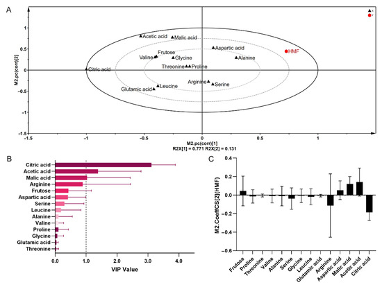 Partial least squares regression (PLSR) of the amino acids, sugars, organic acids, 5-HMF in black garlic ((A): loading plot, (B): VIP plot, (C): coefficient plot).