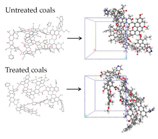 Coal molecule structure models before and after treatment, Color code: C (gray), H (white), O (red), N (blue), S (yellow) [25].