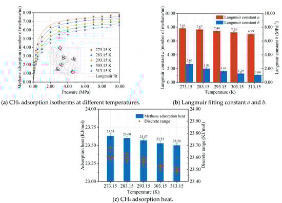 The most intuitive change in the coal samples under the effect of cyclic microwave modification is the increase in temperature. A Smart Sensor AS825B infrared thermometer from Sigma was used to measure the surface temperature of the modified coal, and it was found that the surface temperature of the coal samples generally increased, reaching 373.15 K at the highest point. To investigate the change in the law of methane adsorption in coal due to the microwave, methane adsorption isotherms were simulated by selecting 273.15–313.15 K. The simulation results of methane adsorption at different temperature conditions are shown in Figure 3. Figure 3a shows that the adsorption of methane in the coal model under the temperature range of 273.15 to 313.15 K conforms to the Langmuir adsorption model. Figure 3b shows the Langmuir fitting parameters, and Figure 3c shows the thermodynamic information of methane adsorption. It can be seen that the warming effect of the coal seam caused by the microwave modification reduces the adsorption performance of methane in coal, and the higher the temperature, the lower the adsorption. This means that more methane gas is present in the coal seam in the Free State, making the modified methane extraction more efficient.