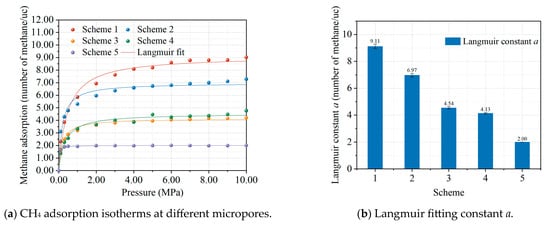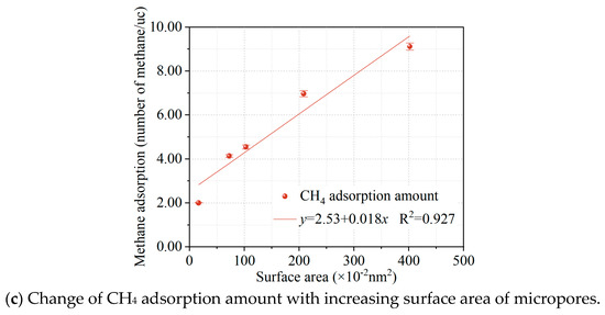 The results of methane adsorption under different micropore volume conditions are shown in Figure 4. The methane adsorption at different micropore volumes is shown in Figure 4a. After fitting the Langmuir formula, it was found that the methane adsorption under different micropore volume conditions was in accordance with the Langmuir adsorption model, and the results of fitting the Langmuir parameters are shown in Figure 4b. It can be seen that the amount of methane adsorbed decreases as the pore volume of the micropores in the coal model decreases, which is consistent with the theoretical calculation by Cheng et al. that concluded that methane in coal is mainly filled in the micropores of the coal [14]. Figure 4c shows the relationship between different surface areas and the amount of methane adsorbed in coal, which shows that the amount of methane adsorbed in coal increases linearly with the increasing surface area of the micropores. The simulation results confirm the conclusion that the microwave modification leads to a reduction in micropores and a decrease in methane adsorption in the coal.