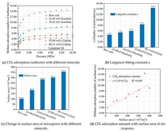 The simulation results of the methane adsorption in the coal-rock compound models are shown in Figure 5. Figure 5a shows the methane adsorption isotherms, which were fitted by the Langmuir model, and the results are shown in Figure 5b. It can be seen that the associated minerals in the coal also adsorb a certain amount of methane, which is consistent with the experimental results of Feng et al. [28]. The variation in pore volume in the structural model of coal when minerals are present is shown in Figure 5c,d. It can be seen that the amount of adsorbed methane in the compound models increases linearly with increasing the pore area, implying that methane is also adsorbed in the micropores of the mineral.