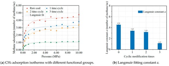 Effect of functional groups after cyclic modification times on CH4 adsorption (a) and Langmuir fitting constant a (b). Each colored curve in the figure corresponds to its respective Langmuir fitting.