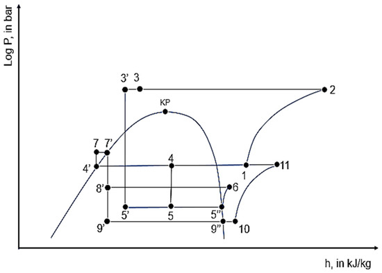 The thermodynamic processes and states of a real refrigeration system significantly deviate from the theoretical cycle. The pressure drop is intrinsic to the real flow. The working fluid is not a pure substance due to the presence of oil and other contaminants, and the real compression process is not isentropic. The final temperature of the refrigerant after a real compression process is always higher than that after isentropic compression [23]. The heat transfer process is irreversible due to the finite temperature difference and is non-isobaric due to the pressure drop. These deviations imply irreversibility within a real refrigeration system, which indicates a reduction in efficiency and the need for additional compression power. In the design phase, the superheating of the refrigerant at the outlet of the evaporator and subcooling of the refrigerant at the outlet of the gas cooler were considered to ensure the efficient operation of the entire system [24].