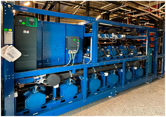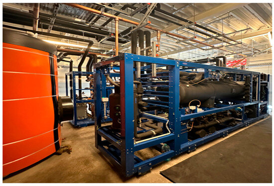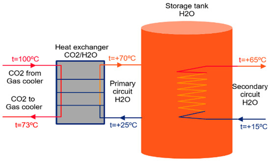 Waste heat utilization has become a priority research area in the international refrigeration field. Both refrigeration plants were designed to partially recover the condensing heat to produce domestic hot water. Therefore, a heat exchanger (HEX) CO2–H2O, with a capacity of 40 kW, was installed on the frame of the refrigeration plant, and a storage tank of 2500 L with an additional coil was installed. The primary circuit between the heat exchanger and the storage tank provides water at 70 °C flow and 25 °C return, and the secondary circuit between the storage tank and the consumers provides domestic hot water at 65 °C flow and 15 °C return. Figure 7 shows the storage tank in orange and the HEX in silver, and Figure 8 presents a schematic of the system.
