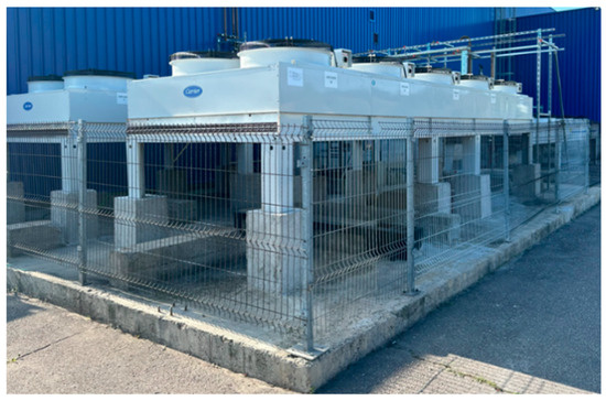 The plant in Bălți is equipped with two gas coolers (Figure 4) of type GASCO.AL91 CO2 6MDE EC M1 SV, both with vertical air flow, six fans, a 121,800 m3/h air flow rate, and 1152 m2 coil surface, and with a total mass flow rate calculated on the refrigerant side of 11,418 kg/h. The plant in Chișinău is equipped with two gas coolers, type GASCO.AL91 CO2 10MDE EC M1 SV, both with vertical air flow, ten fans, 163,551 m3/h air flow rate, and 1280 m2 coil surface, with a total mass flow rate calculated on the refrigerant side of 11,842 kg/h.