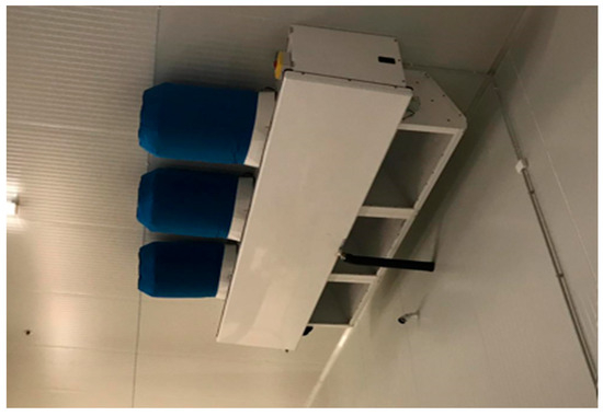Figure 5 shows horizontal remote cabinets for freezing products inside the sales area, and Figure 6 shows an evaporator inside the freezer room, equipped with kit for shut-up defrost (blue ones in front of the fans) and kit for rear air direction (insulated cover with same white colour as the evaporator and situated in the back side of the evaporator).