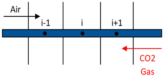 The operation of the air-cooled gas cooler can be described using the distributed modelling method [31]. For efficient modelling, the gas cooler was divided into discrete segments, as shown in Figure 9. The ε-NTU method establishes the governing equations in the i-th segment. Therefore, the heat flux in the i-th segment can be written as