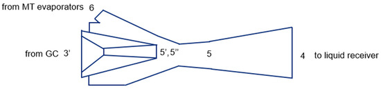 3-3′-5-4: CO2 gas passes through a HEX of the gas line and then through the EJ (where it expands) to the liquid receiver. The ejector sucks in the gas from the medium-pressure consumers and increases its pressure to the higher-pressure receiver. The mixture of liquid and gas exiting the EJ flows to the liquid receiver.