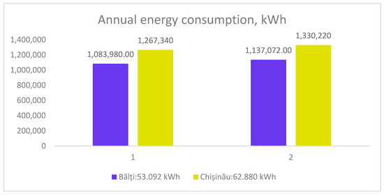 The operation of the plant shown in Figure 1 was simulated based on the mathematical model, using the thermodynamic relationships for each process described above. The simulation was carried out by using the Microsoft Excel program as an interface with the REFPROP library, version 9.1, developed by NIST in 2013 [38]. The input data used were the energy characteristics of each item of equipment and the atmospheric temperature variation in each city from the meteorological data available online on the State Hydrometeorological Service of the Republic of Moldova web site. To simplify the calculations, certain parameters were adopted (Table 1).