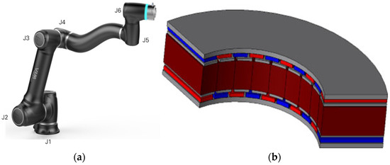 Figure 1 illustrates the structure of a collaborative robot. For the collaborative robot application, an axial flux motor was selected due to its advantages in thin, compact designs. A thin (or flat) structure refers to a motor configuration in which the stacking length is shorter than the outer diameter. The reason axial flux motors are well-suited for such thin structures can be understood by examining the torque equation. Equation (1) presents the torque equation for a radial flux motor.