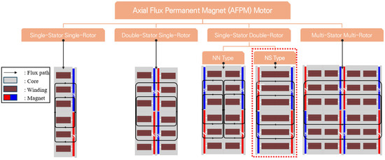 The torque of an axial flux motor is proportional to D 3 , where D represents the rotor diameter. Unlike radial flux motors where the rotor diameter is not equal to the overall motor diameter in axial flux motors, the rotor diameter is equal to the motor diameter. This results in higher torque density. Moreover, since torque increases with the cube of the diameter D 3 in thin motor structures, axial flux motors are particularly advantageous for compact, flat designs. Various types of axial flux motors exist. Figure 2 illustrates several types of axial flux motor configurations. The most basic type is the single-stator, single-rotor structure, but other types can be classified based on the number of stators and rotors. In this study, the reference model employs a single-stator, double-rotor configuration. This type can be further divided into two subtypes: the NN-type and the NS-type. The reference motor used in this paper corresponds to the NS-type. Figure 1b shows the structure of the single-stator, double-rotor axial flux motor designed for collaborative robot applications. In the NS-type, the stator is located between the upper and lower rotors, and the magnetic polarities of the two rotors are opposite to each other.