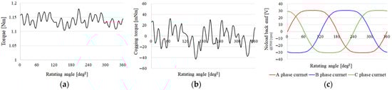 Figure 3. Main performance characteristics of the baseline model: (a) torque; (b) cogging torque; (c) no-load back electromotive force (EMF).