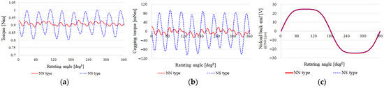 Figure 5. Performance comparison between NN-type and NS-type: (a) torque; (b) cogging torque; (c) no-load back-EMF.
