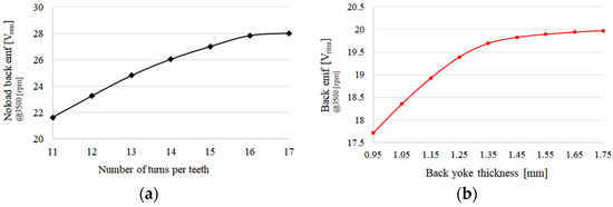 Figure 8. Back-EMF variation according to key design parameters: (a) back-EMF versus number of turns per teeth, (b) back-EMF versus rotor back yoke thickness.