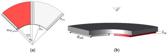 Here, R c   is defined as the average radius between the inner and outer radii of the axial permanent magnet. R s t k is defined as the radial length of the motor, calculated by subtracting the inner radius from the outer radius. The term m a g s p a c e refers to the spacing between magnets, which is determined based on the selected pole arc ratio. In the case of axial flux motors, accurately determining the magnet width is challenging because, unlike in radial SPM motors, the inner and outer arc lengths of the magnets differ due to their circular geometry. To address this, a practical approach is adopted: a reference radius R i n w   defined at one-quarter of the radial length from the inner radius. Using this intermediate radius, the effective magnet width can be estimated, as illustrated in Figure 13.
