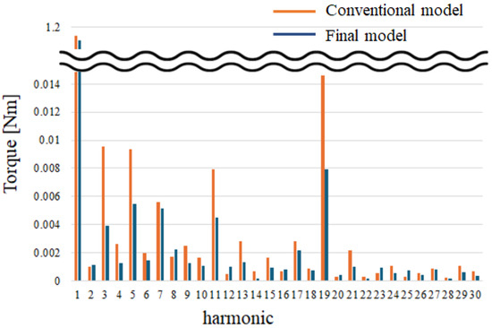 As shown in Table 6, the conventional model and the final model exhibit comparable performance. The no-load back-EMF and torque values are similar between the two models. However, differences are observed in terms of losses, output power, and efficiency. Losses are primarily categorized into core loss and eddy current loss. In this study, core eddy current loss refers to the eddy current loss generated in components made of S45C material, such as the rotor back yoke or magnet regions that have been replaced with core material in the ICP structure. The core loss of the conventional model is 46.33 W, whereas the final model achieves a reduced value of 34.97 W, representing a 24.5% reduction. However, the core eddy current loss increased significantly from 1.16 W to 7.16 W, which is approximately a 6.2-fold increase. As a result, the total core-related losses decreased from 60.19 W to 56.78 W, showing an overall 5.66% reduction. The copper loss increased slightly, from 12.08 W to 14.05 W, which is an approximate 1.5% increase. Nevertheless, due to the overall decrease in total losses, the efficiency improved from 86.12% to 86.78%. This improvement is mainly attributed to the reduction in rotor back yoke and teeth thickness in the final model, which helped lower core losses. Although additional coil turns were required leading to a slight increase in copper loss the increase in coil length was limited due to the reduced teeth width. As a result, the rise in copper loss was minimal. Finally, a harmonic analysis of the torque waveform was performed using FFT (Fast Fourier Transform). The torque harmonics are illustrated in Figure 13.