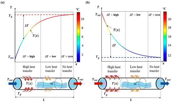 Heat is transferred between the flowing heat carrier fluid in the underground pipe and the surrounding environment through the following mechanisms: convention facilitates heat transfer from the water to the inner surface of the pipe, while conduction carries the heat from the inner pipe wall to the outer pipe wall and subsequently to the surrounding soil. The heat transfer performance of vertical ground heat exchangers (GHEs) is significantly influenced by the underground medium, which includes the pipe material, backfill material, and soil. Each of these materials has distinct thermo-physical properties, such as, specific heat capacity, density, and thermal conductivity, all of which directly impact the overall efficiency of heat transfer [5,6]. Figure 1a illustrates the heat transfer mechanism between the water flowing through the vertical U-tube pipe and the surrounding ground during the heating mode. denotes the water temperature, is the ground temperature, is the pipe length, and is the temperature difference, calculated as . Geothermal heat pump systems (GHPSs) operate in heating mode (winter time) when the building temperature is lower than the ground temperature, where cooled water is pumped into the ground through the loop pipes. At the start of the pipe, heat transfers rapidly from the ground to the water inside the pipe due to the large temperature difference (). This transfer continues until the temperature difference becomes equal to or close to zero (). If the water velocity is moderate, the water temperature reaches the ground temperature . The heat transfer mechanisms can be categorized as high (), low (), or no heat transfer (), based on the amount of heat transferred in each region, as illustrated in Figure 1. However, GHPSs operate in cooling mode during the summer when the building temperature is higher than the ground temperature. In this mode, heat is transferred from the water inside the pipe to the surrounding ground. As the water flows through the loop pipe, its temperature drops until it approaches the ground temperature, typically just before the pipe exits, if the water velocity is moderate. The heat transfer process between the water flowing through the vertical U-tube pipe and the surrounding ground during the cooling mode is shown in Figure 1b.