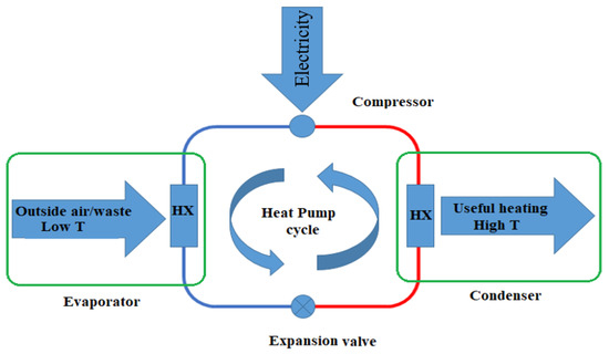 A heat pump is a thermodynamic device that transfers thermal energy from a lower-temperature source to a higher-temperature sink using mechanical work, typically via a vapor-compression refrigeration cycle. This process is significantly more energy-efficient than combustion-based systems, which rely on the generation of heat through fuel consumption. Instead of generating heat, heat pumps relocate it, reducing overall energy use and associated emissions. Due to their high performance and reversibility, heat pumps can be used for both space heating and cooling, making them highly suitable for building climate control applications [29,35,36,37]. The heat pump consists of three main components: the compressor, condenser, and evaporator, as shown in Figure 3. Geothermal heat pumps (GHPs) utilize the relatively stable temperature of the ground as a thermal reservoir, enabling superior efficiency compared to air-source heat pumps, which are affected by ambient temperature fluctuations [37,38]. Recent developments in vapor-compression cycle technologies, such as refrigerant injection and flash tank enhancement, continue to improve the energy efficiency and cold-weather performance of heat pumps, broadening their application potential in colder climates [39,40].