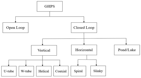 Geothermal heat pump systems (GHPSs) are broadly categorized into two main types based on the configuration of their ground heat exchanger (GHE): open-loop systems and closed-loop systems, as illustrated in Figure 6. Closed-loop systems are further classified into three configurations: vertical, horizontal, and pond/lake systems, depending on how and where the piping network is installed.