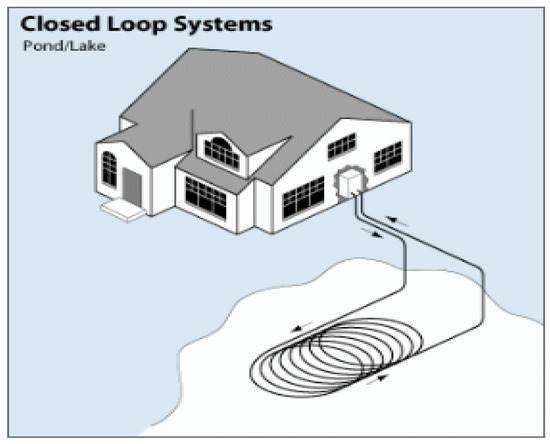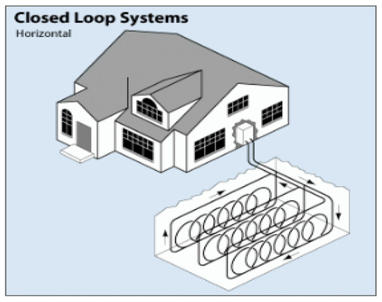 A closed-loop geothermal system is a widely adopted ground-source heat pump (GSHP) configuration in which a heat transfer fluid—typically a mixture of water and antifreeze—is circulated through a sealed network of underground pipes, usually made of high-density polyethylene (HDPE). These systems operate in a closed circuit, meaning the fluid does not come into contact with the surrounding environment and is continuously recycled through the loop. Heat is exchanged between the circulating fluid and the ground: in winter, the fluid absorbs heat from the earth and delivers it to the heat pump, while in summer, it carries excess heat from the building and dissipates it into the cooler ground. This process enables efficient thermal energy transfer with minimal energy input and no depletion of natural groundwater sources. Closed-loop systems are known for their reliability, low environmental impact, and long service life—often exceeding 25 years for indoor components and 50 years for underground piping. They are highly adaptable and can be installed in a variety of configurations—horizontal, vertical, or pond/lake-based—depending on factors such as available land area, subsurface conditions, and project-specific design requirements. These configurations offer flexibility in both urban and rural settings, contributing to the growing popularity of closed-loop systems worldwide. The characteristics and applications of each configuration will be discussed in the following sections [1,3,174,175,176,177,183].