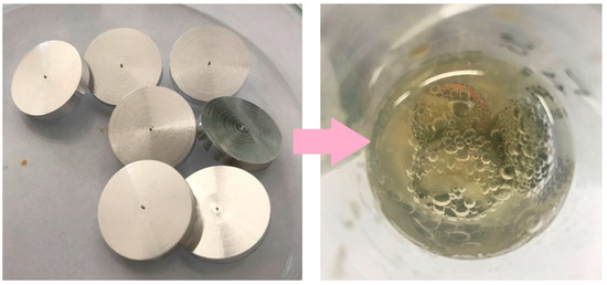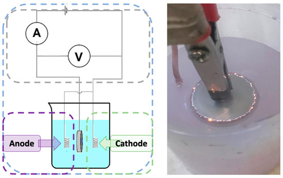 In order to modify the magnesium surface using the plasma electrolytic oxidation (PEO) process, a station consisting of a voltmeter, ammeter and a 100 mL beaker was prepared. Next, 57 mL of previously prepared electrolyte was introduced into the beaker, and then 3 mL of gold nanoparticle solution was added, which gave a total volume of the medium of 60 mL. A magnesium disc was placed in the prepared solution and the PEO process was performed for 5 min using a direct current of 240 V. As a result of this process, a metal oxide layer was formed on the surface of the magnesium disc (Figure 1). A total of six sample groups were prepared (Mg_01 to Mg_06), as detailed in Table 2.