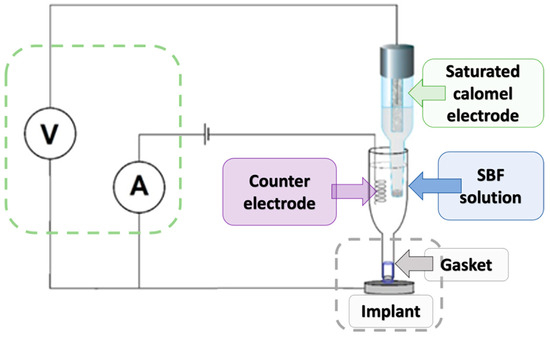 To investigate the corrosion behavior of the tested magnesium-based coatings, a standard three-electrode electrochemical cell was used (Figure 4). The setup consisted of a working electrode (the magnesium implant), a saturated calomel electrode (SCE) serving as the reference electrode, and a platinum wire as the counter electrode. The electrodes were immersed in simulated body fluid (SBF), which mimics the ionic composition of human plasma. The working electrode (implant, n = 3) was placed in a dedicated holder with a sealing gasket to ensure that only a defined surface area was exposed to the solution. The reference electrode was positioned close to the implant surface to minimize ohmic drop, while the counter electrode was placed on the opposite side to complete the circuit. All electrodes were connected to a potentiostat/galvanostat, which controlled the applied potential and recorded the resulting current. The measurement system also included a voltmeter and ammeter to monitor real-time voltage and current values. Potentiodynamic polarization tests were conducted by scanning the potential in the range from −1200 mV to +400/600 mV vs. SCE.