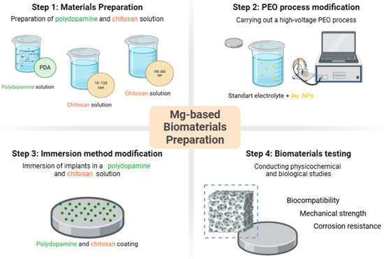 The present study addresses this gap by systematically investigating magnesium implants modified via PEO and further functionalized with chitosan, polydopamine, and gold nanoparticles. A comprehensive characterization of the physicochemical and biological properties of the modified surfaces was conducted using Fourier-transform infrared spectroscopy (FT-IR), scanning electron microscopy (SEM), contact angle goniometry, electrochemical corrosion testing, and cytotoxicity assays using the human MG-63 osteoblastic cell line. The aim is to identify the surface modification strategy that offers the best compromise between structural integrity, degradation control, and biological performance. The findings are intended to contribute toward the rational design of clinically viable Mg-based orthopedic implants that align with the principles of biofunctionality, biocompatibility, and bioresorbability.