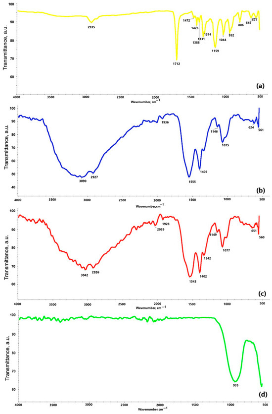 Figure 7 reveals the results of the FT-IR study. The spectrum of the obtained polydopamine compound at Figure 7a reveals a band at a frequency of 2935 cm−1, which likely corresponds to characteristic stretching vibrations of the hydroxyl -OH and amine -NH groups. According to the literature data, these groups appear in the range of 4000–2500 cm−1. A similar pattern can be observed in the chitosan spectra at Figure 7b,c, where bands at frequencies of 3042 cm−1 at Figure 7b and 3090 cm−1 at Figure 7c also correspond to stretching vibrations of hydroxyl groups. Bands in the range of 2000–1500 cm−1 are attributed to stretching vibrations originating from C=C, C=O, C=N, N=N double bonds, as well as bonds present in the aromatic ring, confirming the presence of this ring in all the analyzed samples. For example, the band at 1712 cm−1 at Figure 7a, indicates stretching vibrations of C=C bonds in the aromatic structure. In the range of 1300–1000 cm−1 at Figure 7a, bands corresponding to C–O bonds in the polydopamine (PDA) molecule are observed. The chitosan spectra at Figure 7b,c show common features resulting from the structural similarity of these substances. Bands at frequencies of 2926 cm−1 and 2927 cm−1 are associated with the presence of the –CH2 group, while bands at 1555 cm−1, 1543 cm−1, 1146 cm−1, and 1149 cm−1 confirm the presence of amine groups –NH2. The presence of a β-glycosidic bond between molecules is manifested by bands at 1075 cm−1 and 1077 cm−1. The analysis of the spectrum of the coating obtained by plasma electrolytic oxidation at Figure 7d indicates that the band at a frequency of 935 cm−1 originates from the phosphate groups.