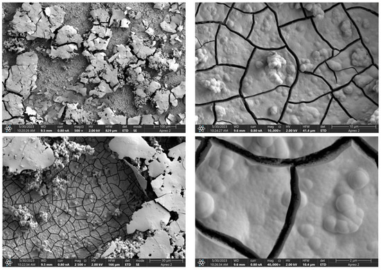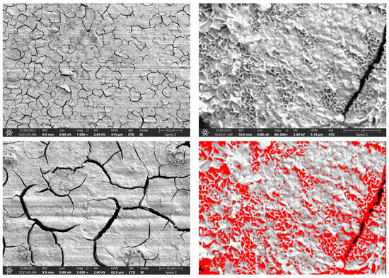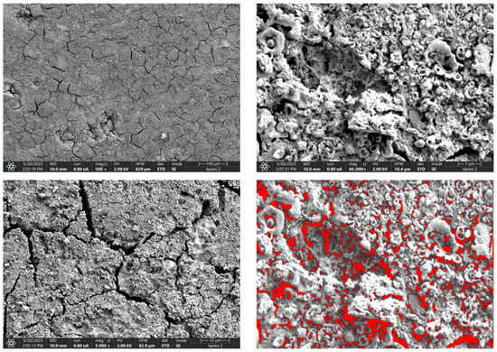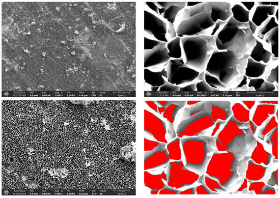 Due to the necessity of meeting specific requirements for SEM measurements, a fragment was cut from the entire set of prepared implants using a Dremel straight grinder. This process led to the formation of surface cracks that will not occur under the actual conditions for which the implants are intended. The analysis of implant surface morphology indicates that plasma electrolytic oxidation significantly affects surface structure, enhancing its adhesive properties. This process increases both the number and quality of pores, which promotes better cell adhesion. Magnesium implants modified with a polydopamine (PDA) coating exhibit the most pronounced porosity while also remaining the least damaged during sample preparation, which also suggests high resistance to damage and hardness. Such a structure facilitates easy cell adhesion after implantation. The SEM image of the discussed sample is presented in Figure 8, Figure 9, Figure 10, Figure 11 and Figure 12, with pores marked in red. When analyzing chitosan coatings, numerous pores can also be observed; however, their structure differs from that of the polydopamine (PDA) coating. The pores in the PDA layer have an irregular shape and a flat surface, resembling a honeycomb structure. In contrast, the chitosan pores are more compact and resemble a sponge, as seen in Figure 8, Figure 9, Figure 10, Figure 11 and Figure 12. In all the examined samples, the porosity level is approximately 50%, indicating that the obtained results meet expectations. The surface of a PEO implant with an applied polydopamine coating shows nanometric pores that remain invisible on the micrometer scale at which the images were taken, as shown in Figure 13. The illustration shows the formed magnesium oxide layer with clusters of polydopamine embedded in it. SEM images confirmed the porous structure of coatings and revealed topographical differences based on coating composition. An ImageJ analysis of SEM images was used to determine mean pore size (µm) and surface coverage (%). The results showed that PDA-coated samples (Mg_06) had the highest average pore size (3.1 ± 0.4 µm) and surface roughness, contributing to greater osteoblast adhesion potential.